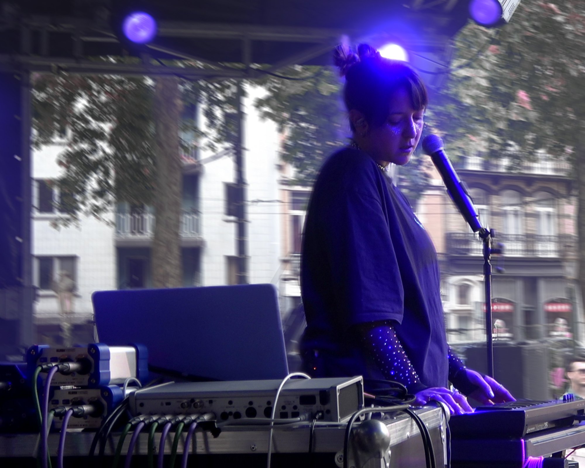 On stage, she creates a fusion universe of weightless piano and vocals, addictive melodies, and bursts of 808. In a cryptic tableau, she sings words of love and struggle, as if to dispel the darkness.